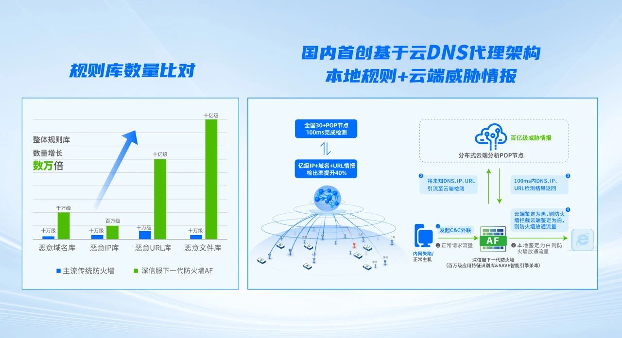 深信服SASE通过云端AI引擎主动探测,对网络流量、用户行为等数据进行深度分析和学习,基于大量历史数据的学习和分析,识别出与正常行为模式不符的异常流量和行为,如挖矿、网络钓鱼和僵尸网络等,未知威胁识别准确率高达99.99%。