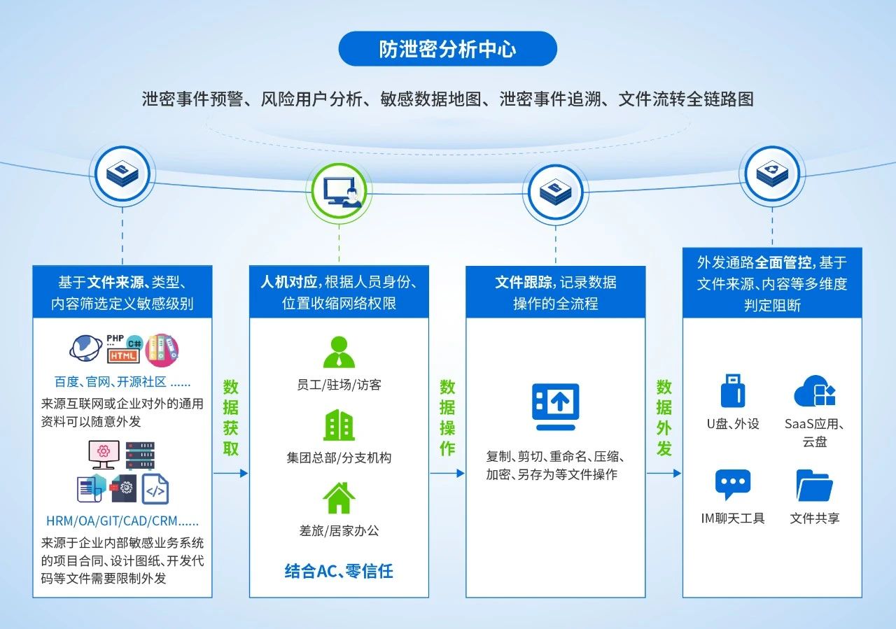通过AI大数据分析对用户业务访问、数据获取、数据变形流转到最终数据外发等行为的上下文关联,结合智能匹配企业定义的敏感数据识别,打通办公应用暴露面收缩、上网高级威胁和未知威胁实时防御管控、办公终端数据防泄密等全流程、全通路和全场景,深信服SASE可为用户提供可视化的高效分析稽查工具,及时发现并处理企业存在的数据泄密风险,保护企业自身利益,管理效率大幅提升。