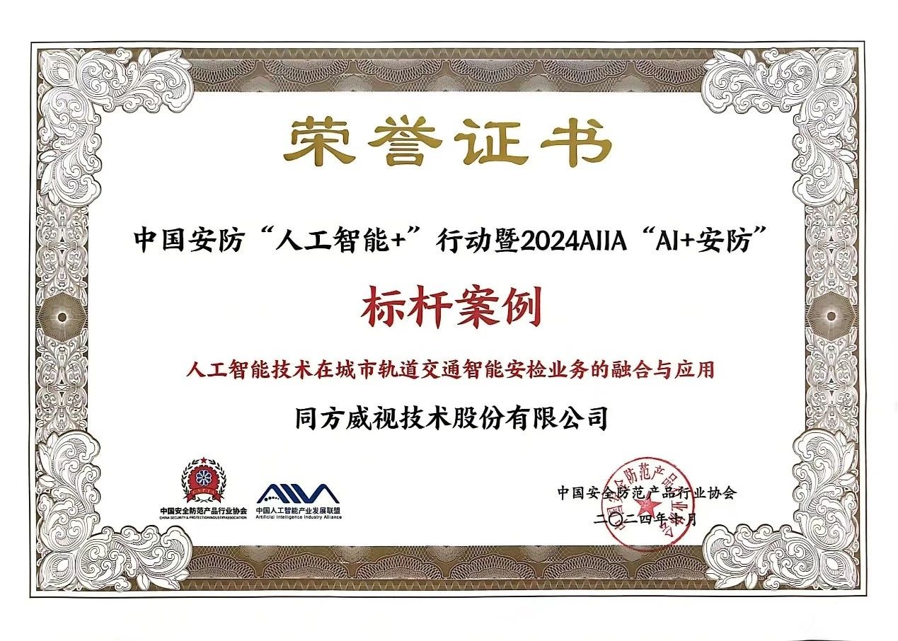 10月22日至25日,第十七届中国国际社会公共安全产品博览会在北京顺义新国展举办。22日晚,“安防之夜”颁证典礼上进行了“AI+安防”标杆案例现场颁奖,同方威视人工智能技术在城市轨道交通智能安检业务的融合与应用成功入选。同方威视国内营销服务总中心副主任赵世峰登台领奖。