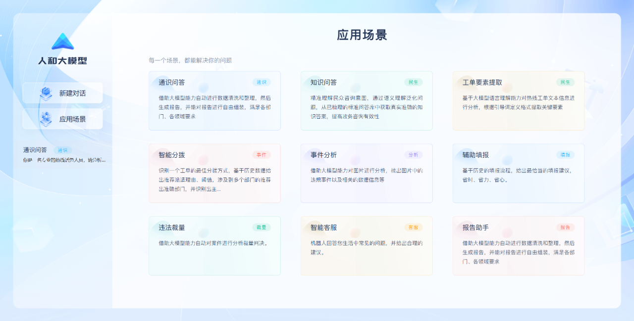 人工智能浪潮席卷全球,快速发展的大模型技术正引领着新一轮科技革命和产业变革。为助力城市治理行业快速拥抱大模型时代,数字政通联合新华三重磅发布城市治理大模型一体机解决方案。城市治理大模型是数字政通从“网格化”到“一网统管”发展过程中,专注于城市治理行业应用,立足于全国5000多个项目沉淀的业务和数据基础,全面拥抱生成式人工智能技术趋势而发布的大模型产品。该模型基于通用大模型底座,结合城市治理行业经验和专业知识进行微调,打造更符合行业需求的应用新范式,具备专业的知识问答、语言理解、文本生成、逻辑推理等能力。同时,通过持续学习和优化,不断提升专业领域的场景应用效果,解决民生诉求、法治政府、城市管理、基层治理、城市运营等行业场景的痛点问题,做城市治理的业务专家。