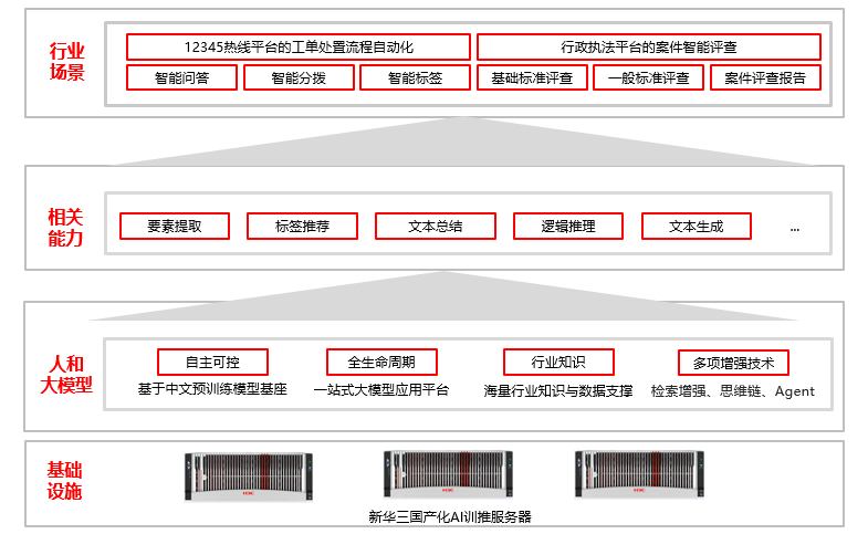 该方案采用新华三全国产大模型训推旗舰H3C UniServer R5330 G7作为智能算力底座,内置数字政通人和大模型,经过多轮次严格测试与优化,针对“12345热线平台的工单处置流程自动化”和“行政执法平台的案件智能评查”这两个场景的私域数据微调后处理准确度达85%以上,应用推理精度达90%以上。
