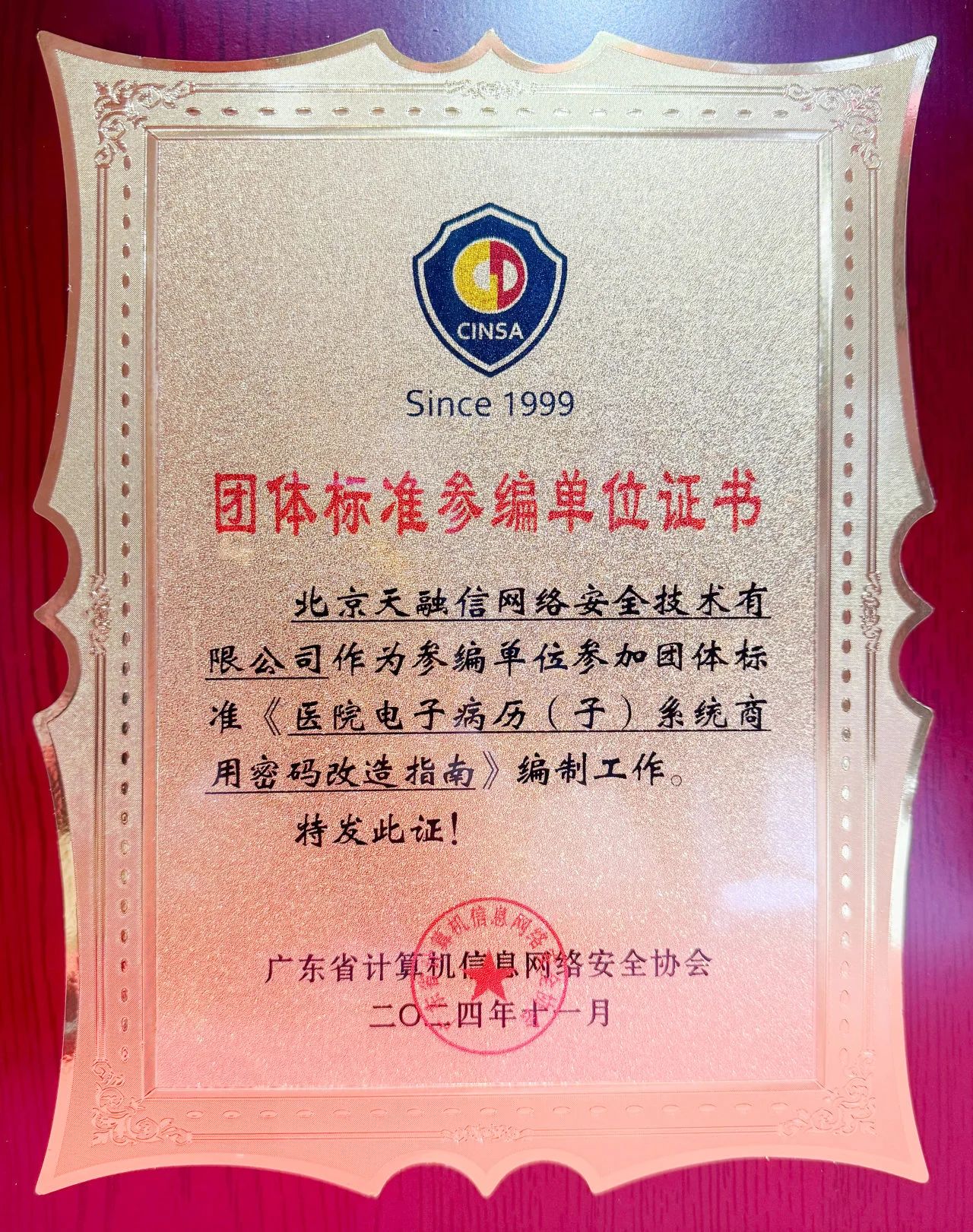 大会现场正式发布了《医院电子病历(子)系统商用密码改造指南(T/GDNS 008—2023)》(以下简称“指南”)等团体标准,并为参编单位颁发“团体标准参编单位证书”。《指南》从商用密码改造工作流程、身份信息保护、电子病历信息保护等方面,提出具体的落地要求和指引,有助于提升医疗机构对患者敏感信息的保护能力。天融信基于在网络安全领域的深厚技术积累,积极参与标准的编制工作并贡献了丰富的研究成果。