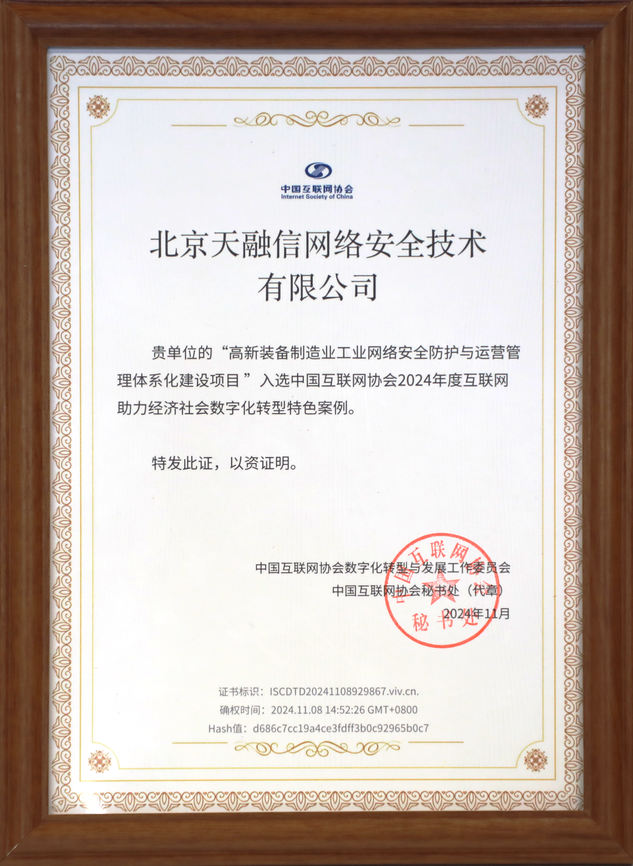 近日,第三届“互联网助力经济社会数字化转型”案例展示评审结果在京揭晓,天融信提报的“高新装备制造业工业网络安全防护与运营管理体系化建设项目”入选中国互联网协会2024年度互联网助力经济社会数字化转型特色案例。