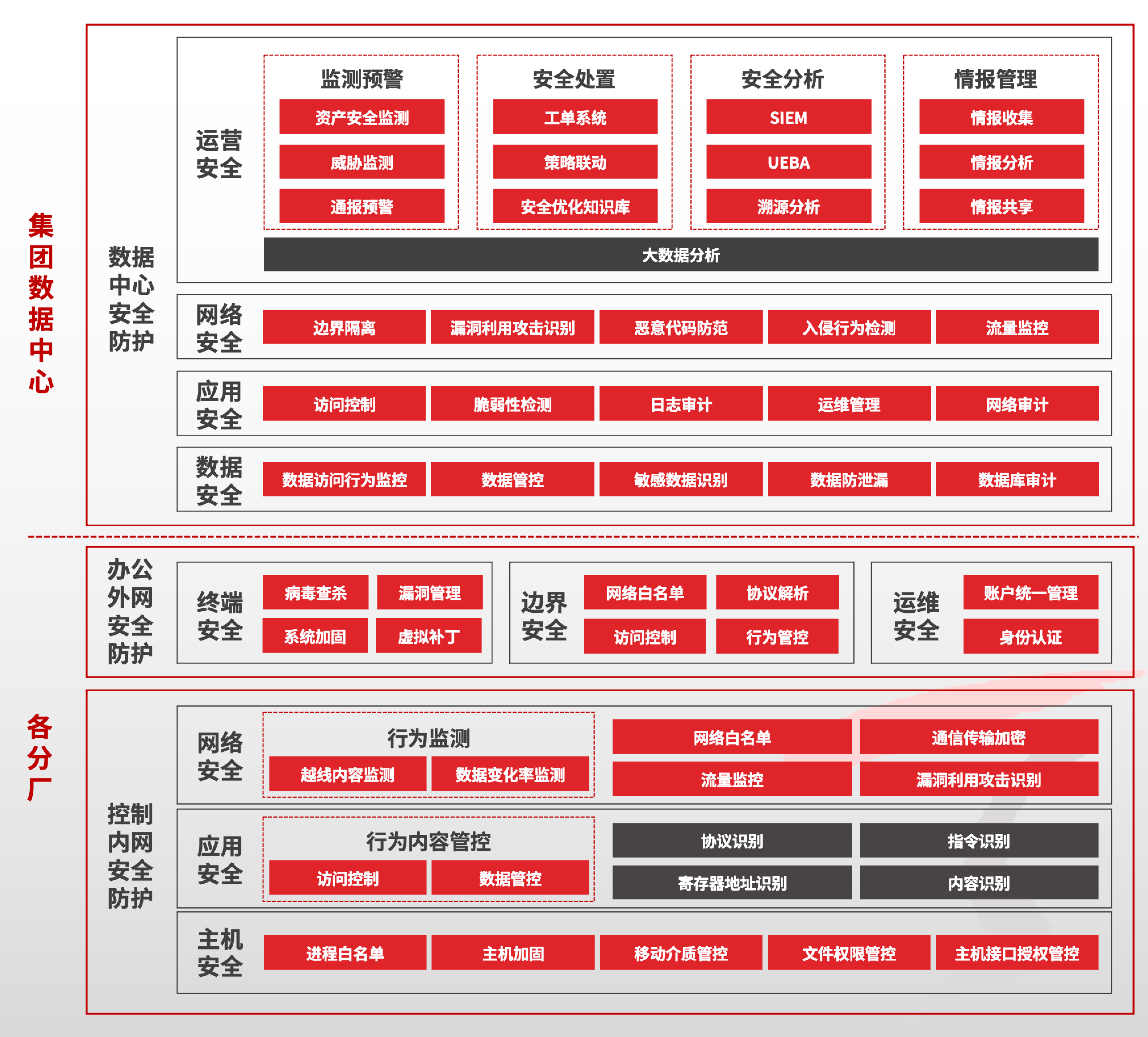 天融信围绕智能工厂业务场景安全需求,打造IT/OT一体化创新安全防护体系。在本次提报的方案中,天融信以企业安全生产运营为核心目标,帮助客户构建了覆盖各分厂控制内网、企业办公外网和集团数据中心安全防护场景的综合防护与运营管理平台,形成网络监测、行为审计、访问控制、主机管控、脆弱性识别、态势监测、运营分析等综合安全能力,有效提升企业整体网络安全防护水平。