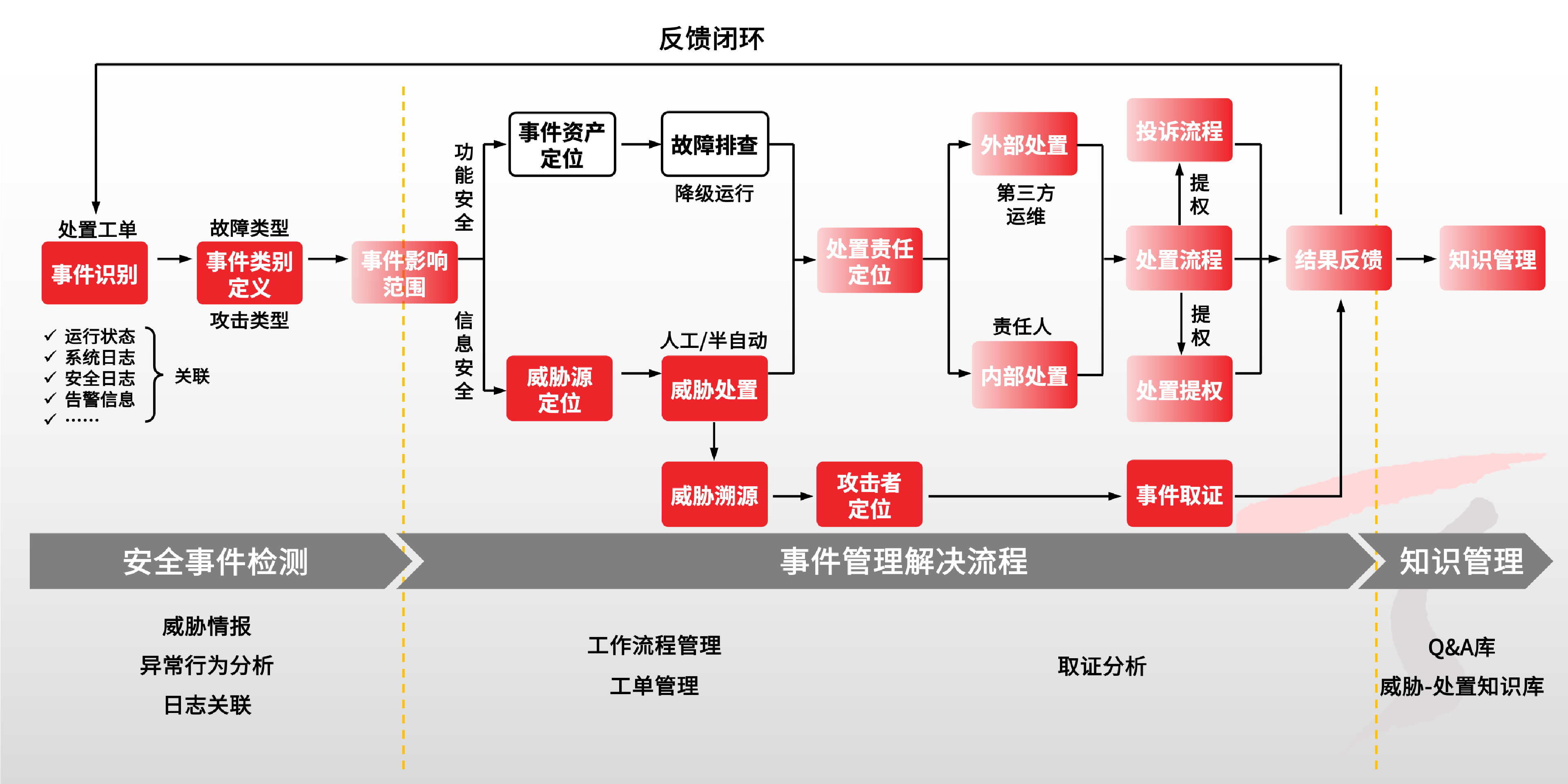 在业务运行中,系统可依据识别的安全事件及运维内容,生成安全管理工单,同步安全处置及操作的责任部门并进行处理,运维行为形成痕迹化管理。同时,通过对安全事件产生的数据进行全面的收集、整理与分析,提炼有价值的信息形成安全知识库,以此作为事件响应的基础,实现高效、闭环的安全事件处置机制。