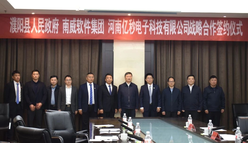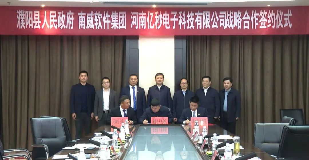 11月27日,濮阳县人民政府与南威软件集团、河南亿秒电子科技有限公司在濮阳迎宾馆进行会谈并签署战略合作协议。濮阳市委常委、常务副市长周东柯,濮阳县委常委、常务副县长赵岩,县政府党组成员谷明起,南威软件集团董事、执行总裁洪创业,河南亿秒电子科技有限公司董事长张宏排,南威软件集团中部大区业务群副总裁彭战胜等出席。
