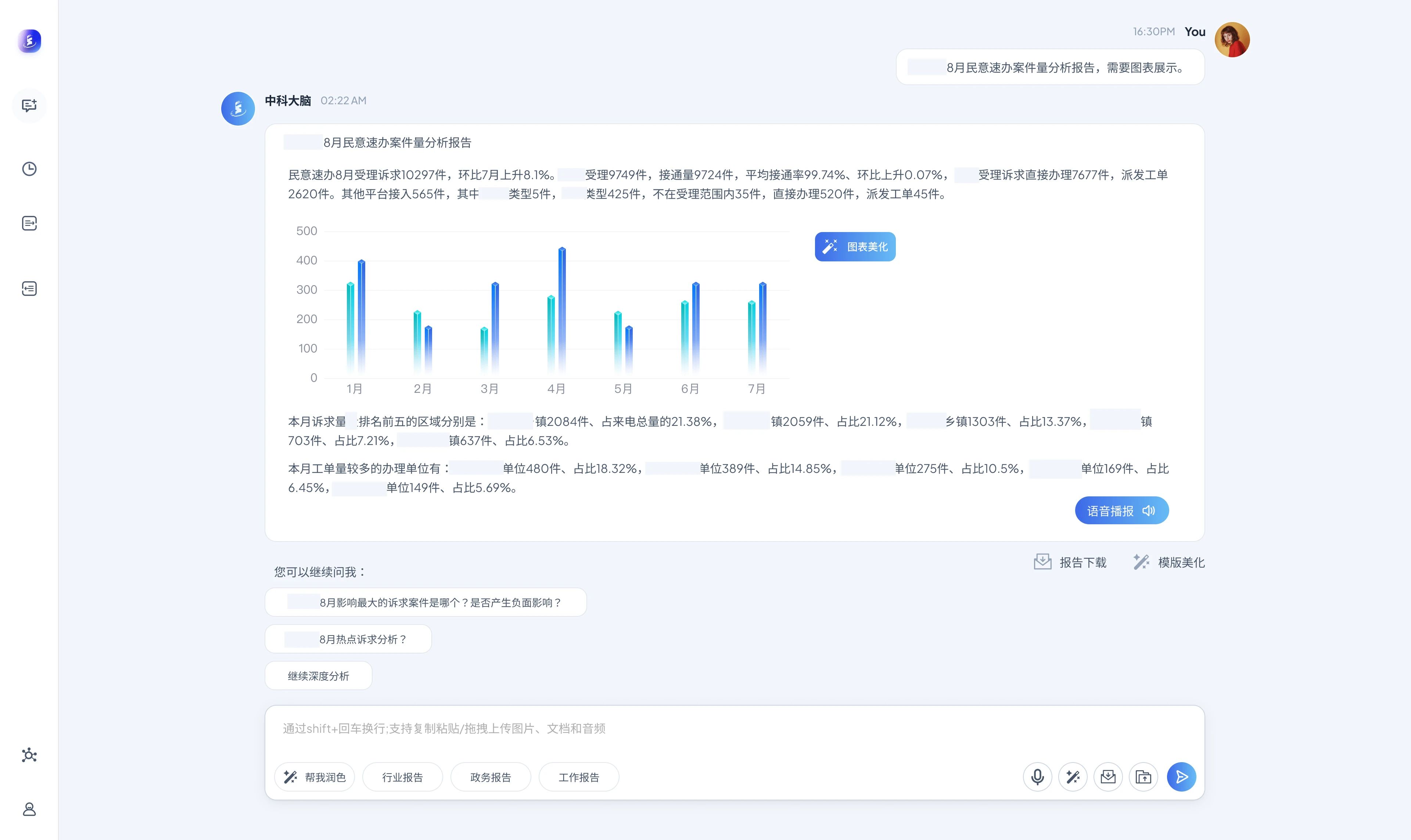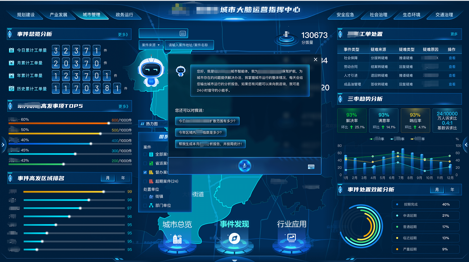 智能问答智能体精准解析市民诉求语义,自动关联责任部门与处置案例库,大幅提升工单分派准确率;智能分析智能体同步生成事件热力图与周期性总结报告。