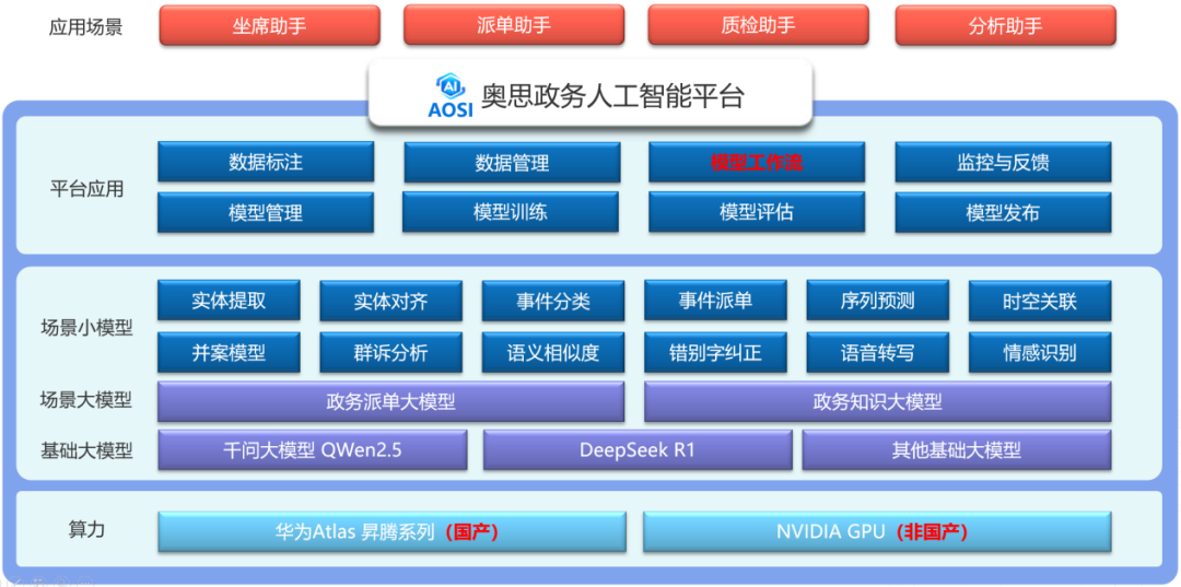 “奥思”是吉奥时空面向政务行业应用的、基于“大模型+小模型”技术研发的人工智能应用平台产品,也是一个集数据标注、模型训练、模型微调、模型工作流、模型发布、版本管理等功能的人工智能模型管理平台。“奥思”具备智能分类、智能派单、智能问答、智能总结、语音转写、实体提取、实体对齐、情绪识别、相似分析、语义检索等多种能力,可为政务热线、智慧城管、城市运行管理等多领域智能化应用场景赋能。