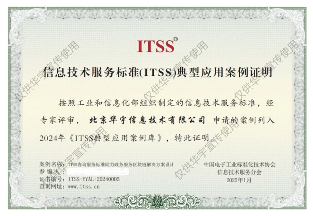 近日,华宇“ITSS咨询服务标准助力政务服务区块链解决方案设计”案例经专家评审后成功入选由全国信息技术标准化技术委员会信息技术服务分技术委员会和中国电子工业标准化技术协会信息技术服务分会(以下简称“ITSS分会”)联合组织建立的“信息技术服务标准(ITSS)典型应用案例库”。