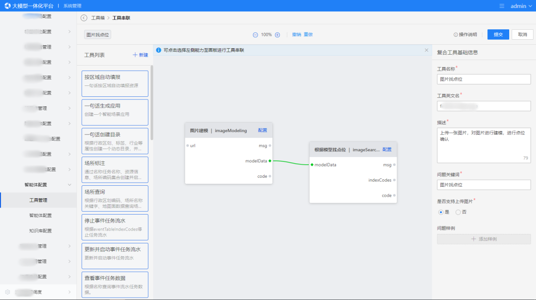 敏捷开发体系:提供可视化模型训练、微调,应用设计编排工具,通过零代码或低代码的方式,快速构建场景应用。