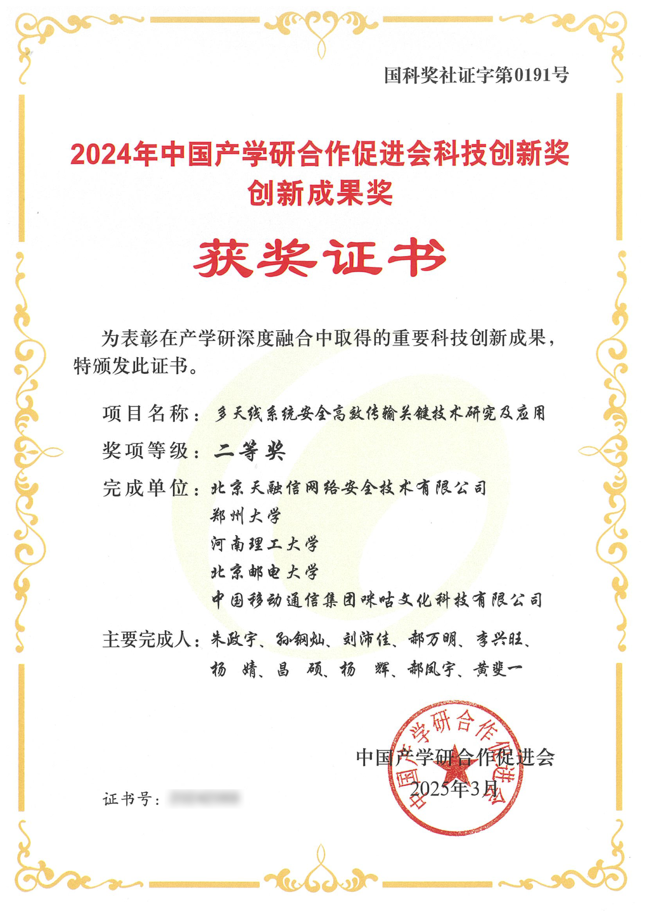 今年,再度携手郑州大学等获「中国产学研合作创新成果二等奖」,是中国产学研合作促进会对天融信在产学研协同创新领域持续深耕的权威认可,更是对企业在科技成果转化、现代化产业体系建设等方面突出贡献的充分肯定。