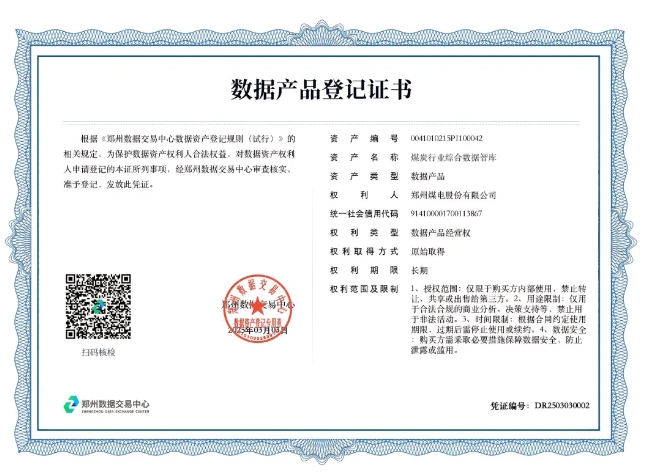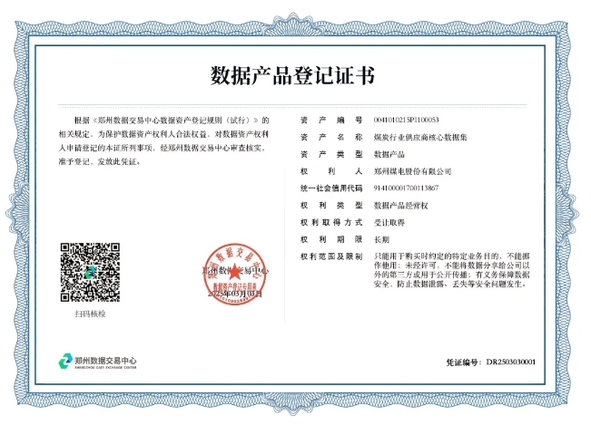 近日,郑州煤电(郑州煤电股份有限公司)自主研发的“煤炭行业综合数据智库”、“煤炭行业供应商核心数据集”两款数据产品,正式通过郑州数据交易中心登记挂牌,成为河南省煤炭行业首批获得数据产品登记证书的标杆案例。