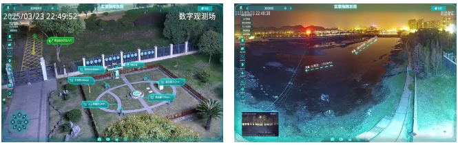 平台还支持一键切换查看多个场景标签,提升信息获取效率。在测流断面180°全景视窗中,同步叠加水文站已有的测流设备(例如流量数据时差法、雷达桥测等),配合左下角变焦特写窗口,实现高空全景与地面细节的智能联动以及远距离河道范围内工程活动和异常状况的实时追踪。