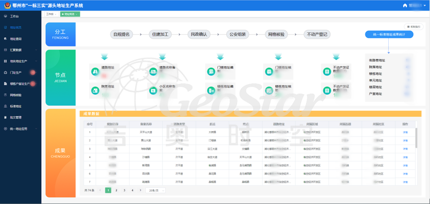 在应用体系构建中,吉奥时空创新提出“自规提名、住建加工、民政确认、不动产登记、公安组装、网格核验”的统一标准地址生产“流水线”模式,为地址管理工作带来了全新的思路和方法。驱动治理流程再造,打破部门数据壁垒,将地址标准化生产深度嵌入日常业务流程,该体系通过跨部门数据实时交互与业务无缝衔接,实现地址数据从源头生成到动态更新的闭环管理,构建起地址信息可持续更新的长效机制,从数据源头提升政务服务效能。