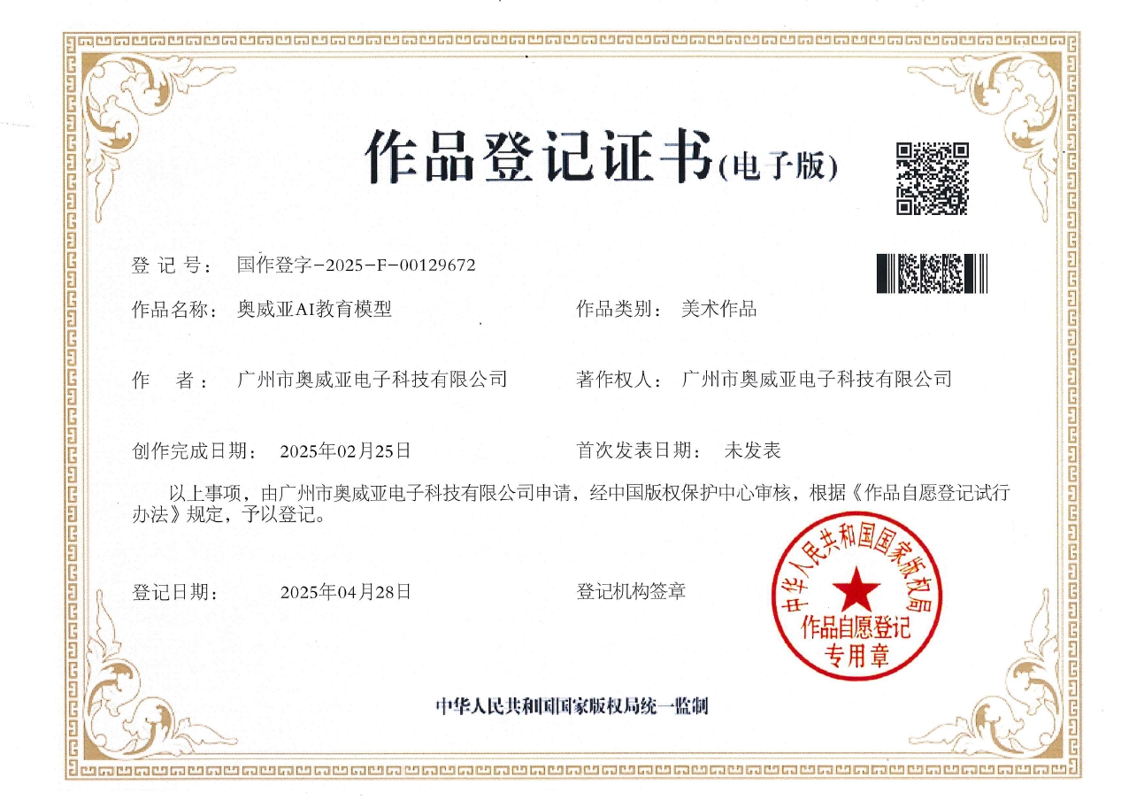 近日,奥威亚品牌建设迎来重要成果:公司自主研发的核心产品“奥威亚AI教育模型”及“师途智伴”——二者的专属标识已经国家版权局审核,成功完成作品版权登记并正式获得作品登记证书。这是奥威亚构建全面、立体品牌保护体系以及加固核心产品知识产权护城河的关键一步,也为奥威亚提升核心竞争力和企业软实力奠定了坚实的法律基础。