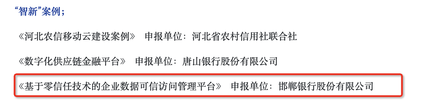 据了解,“金信通”金融科技创新应用案例征集活动旨在挖掘金融科技领域的优秀实践成果,本次活动中,河北省共有9家金融机构的10项案例成功入围,充分展现了河北省银行业在金融科技创新领域的扎实实践。而邯郸银行此次入选的案例,正是依托指掌易领先的零信任技术构建而成,是指掌易技术能力与服务水平深度赋能金融机构数字化转型的典型成果。