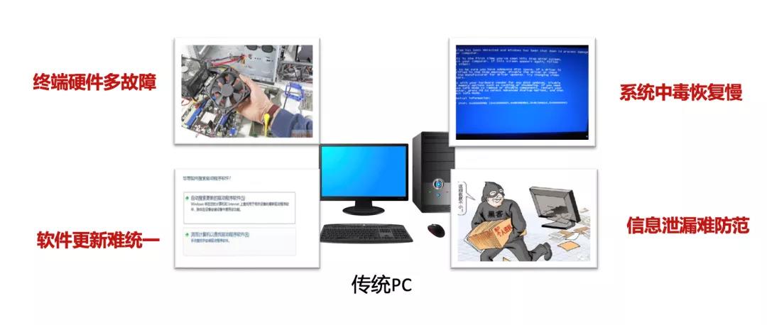 随着“智慧警务”建设的推进,各类业务系统和办案终端不断增加,案件处理效率极大提高,但这也给IT维护提出了新的挑战。同时,建设规模的持续扩大,传统PC固有缺点在办公办案过程中愈发凸显: