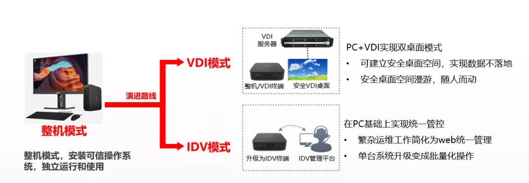 锐捷网络在云桌面领域深耕多年,连续5年VDI终端出货量排名第一(数据来源IDC统计报告)。结合多年行业经验,锐捷创新推出了VDI+IDV “XC双擎云桌面”模式。其中,IDV管理上云,可以对主机统一管理,高效维护终端桌面镜像,进而实现系统升级,以及快速还原等管理功能;而PC+VDI实现的双桌面模式,则可建立安全桌面空间,满足公安行业“数据不落地”高安全要求,同时利用桌面空间漫游特性,支持“数据随人走”的高效办公场景,无论是在分局还是派出所都能便捷访问自己的数据。
