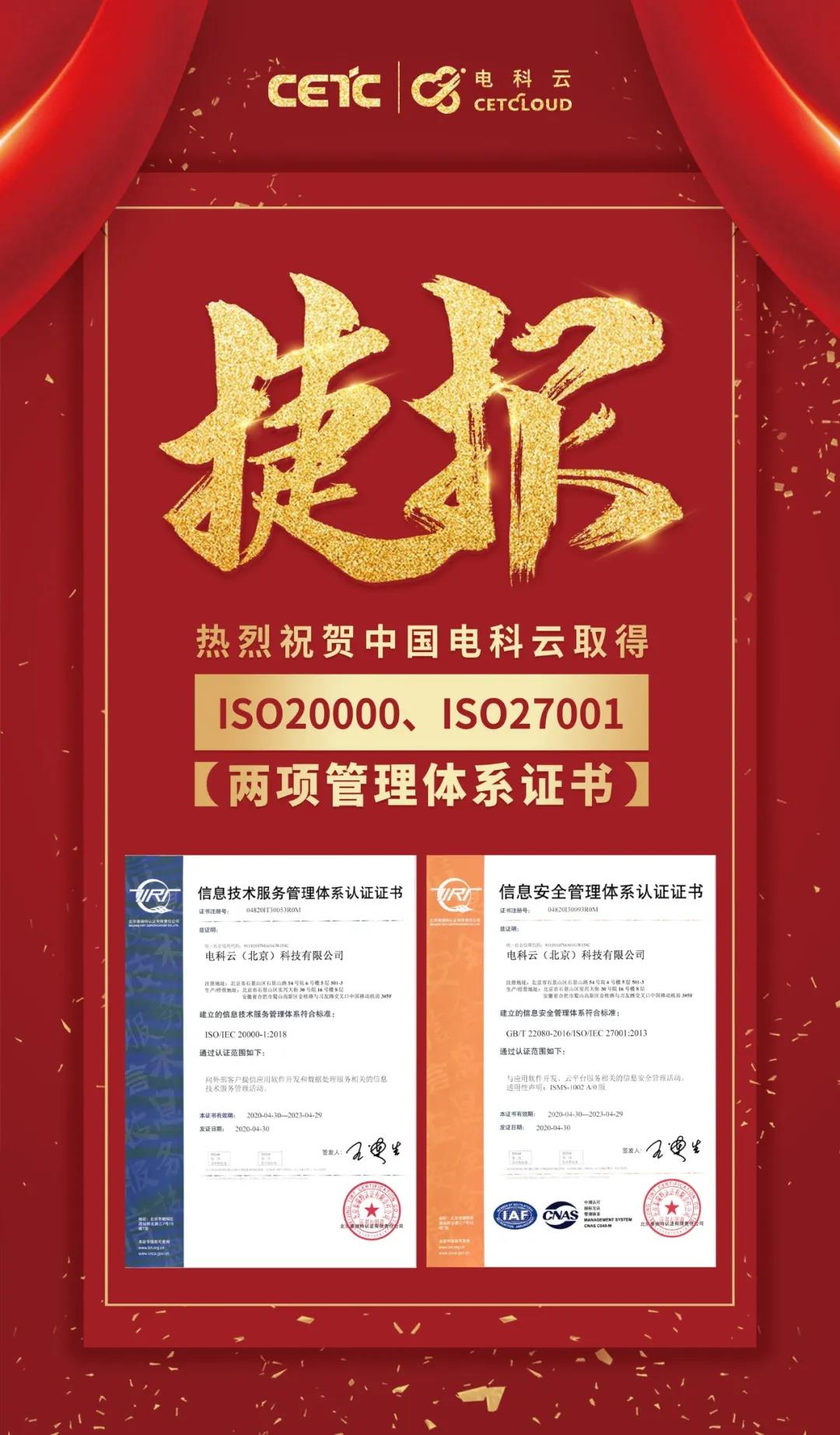 近日,中国电科云公司顺利通过ISO(国际标准化组织)两项管理体系认证:ISO20000信息技术服务管理体系和ISO27001信息安全管理体系认证。这标志着公司在信息技术服务管理、信息安全管理方面进一步趋于规范,在信息技术服务管理和信息安全管理正规化过程中具有里程碑的意义。
