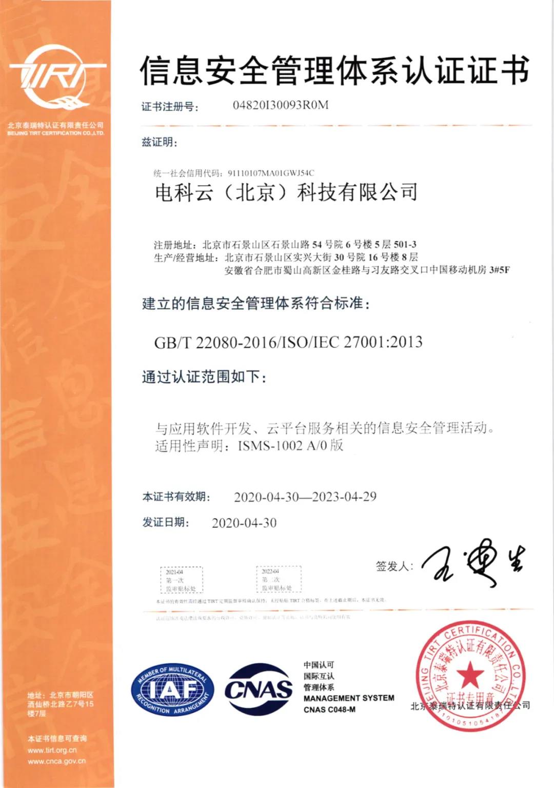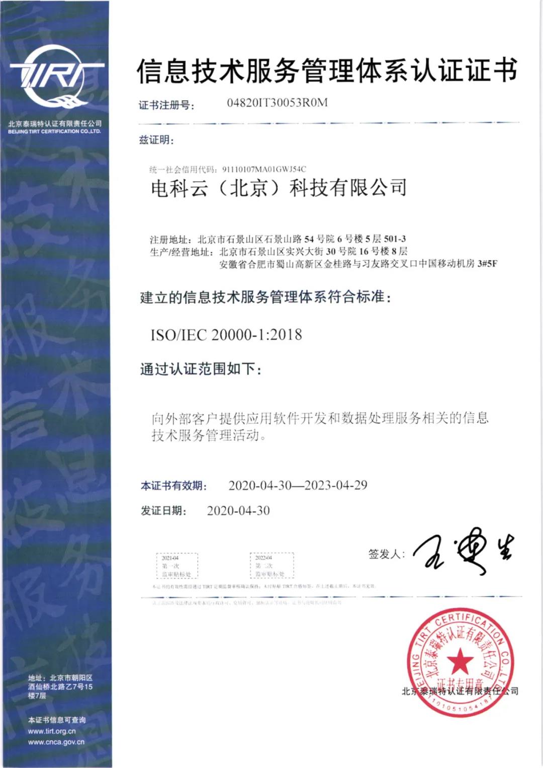 2019年8月,公司组织ISO20000和ISO27001标准的贯标培训,10月正式发布管理手册和程序文件。经过6个月的管理体系试运行,2020年4月公司迎来北京泰瑞特认证有限责任公司的现场审核,经过细致的审核,审核组认为公司管理体系运行有效,符合标准要求,可以通过认证。