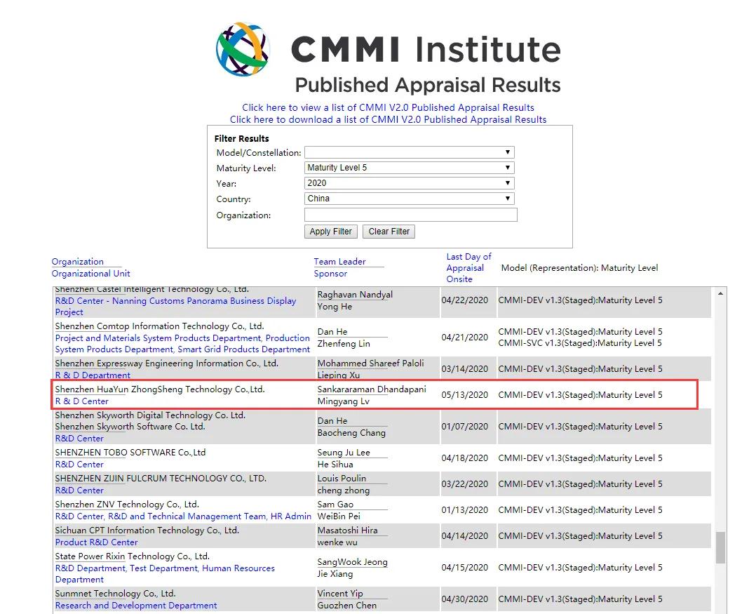 近日从CMMI institute官网查询获悉,华云中盛正式通过了CMMI 5级认证评估, 这标志着公司软件研发能力已达到行业高水平,在标准化、规范化、国际化的发展道路上走在了行业前列,并在软件开发管理标准过程体系、过程改进实施情况、项目管理能力等方面提升到了一个新的高度,为公司产品的持续创新和升级奠定了坚实的技术基础。