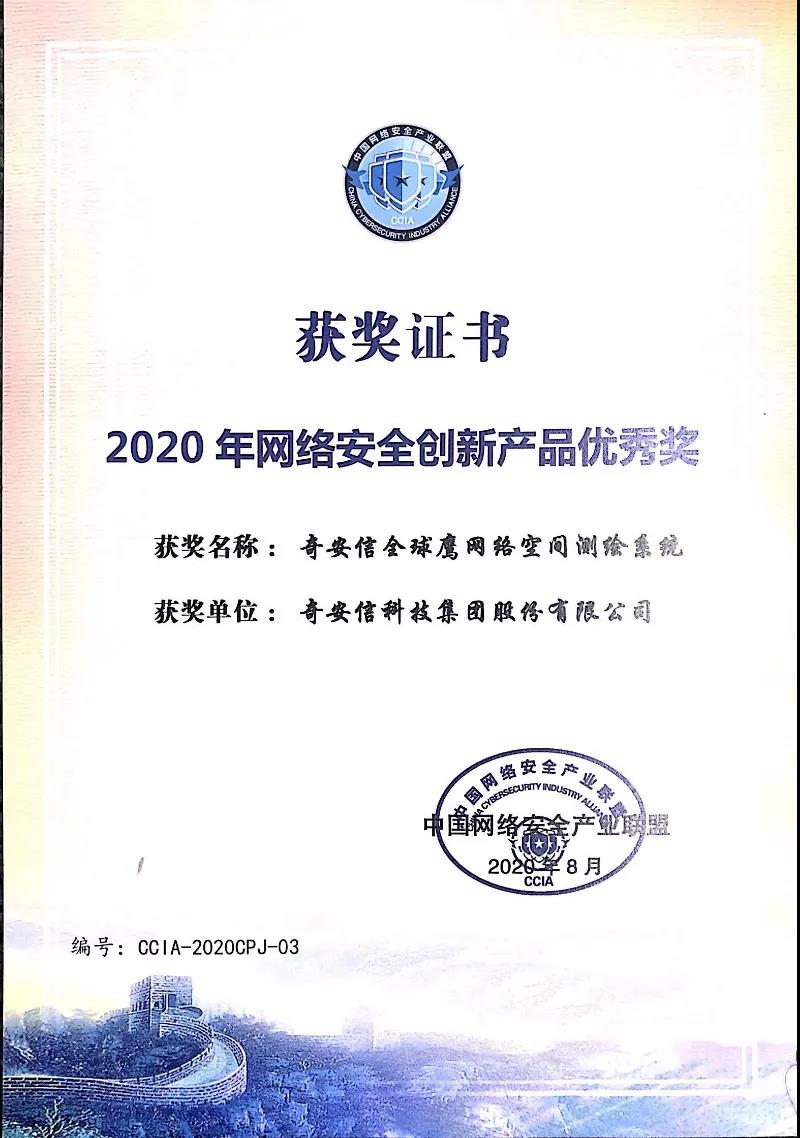 9月15日,在中国网络安全产业联盟(CCIA)举办的“2020年国家网络安全宣传周——网络安全产业创新发展论坛”上,奇安信全球鹰网络空间测绘系统荣获“2020年网络安全创新产品优秀奖”。