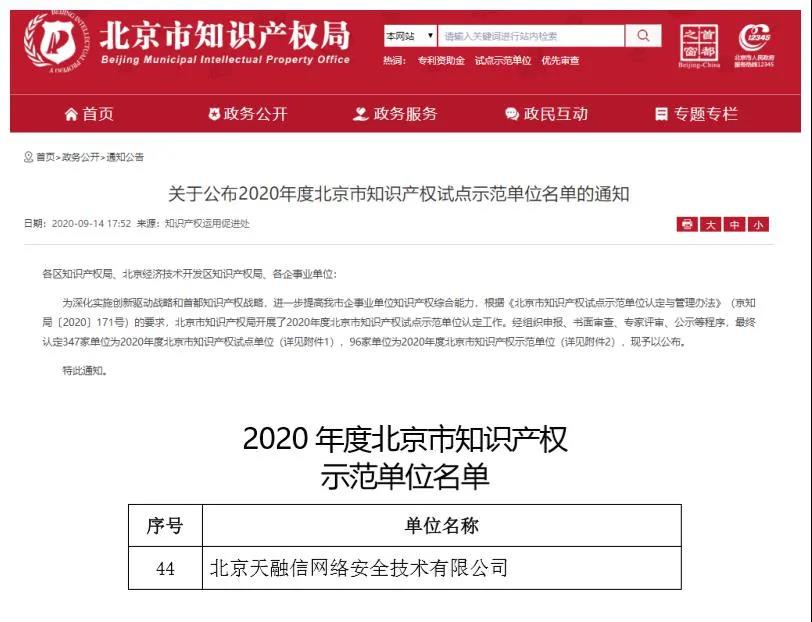 近日,北京市知识产权局对外正式公布了2020年度北京市知识产权试点示范单位名单。天融信凭借优秀的自主创新能力及完善的知识产权管理体系,被认定为2020年度北京市知识产权示范单位。