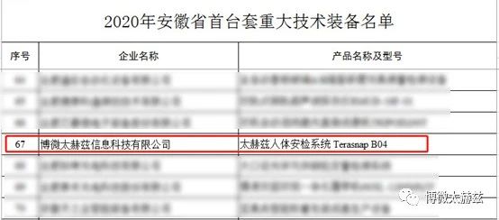 近日,安徽省经济和信息化厅公布“关于公布2020年安徽省首台套重大技术装备名单的通知”,博微太赫兹自主研发的“太赫兹人体安检系统 Terasnap B04”产品被认定为2020年度安徽省“首台套”重大技术装备。这也是博微太赫兹连续三次荣获安徽省“首台套”项目认定。