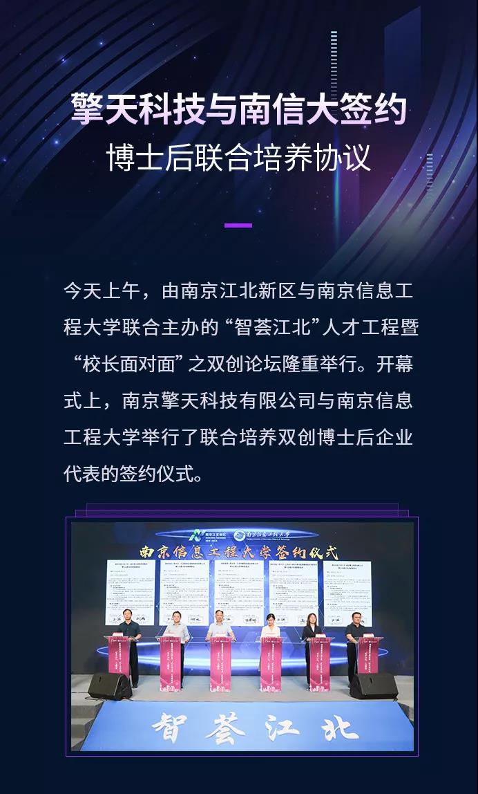为促进政产学研合作,落实江北新区“双聘双创”人才政策,在南京江北新区支持下,南京擎天科技有限公司与南京信息工程大学将联合培养博士后。未来,将以擎天科技博士后科研工作站为主招收,南信大博士后科研流动站在招收名额、管理费、导师、平台支持、项目申报等方面提供优先支持。
