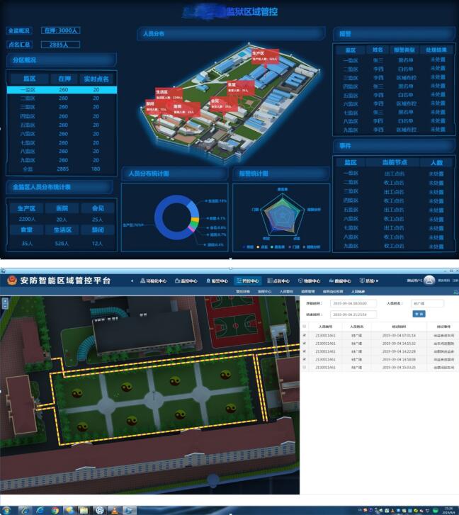 区域犯人管控系统可以实现对全狱、各监区的固定区域(监舍、车间)犯人和流动区域(医院、会见室、禁闭室)犯人实时人数、实时流动情况进行可视化的管控,通过指挥中心、监区警务台可以即时了解掌握各区域犯人实时点名数据、监区犯人实时分布情况及实时流动情况。
