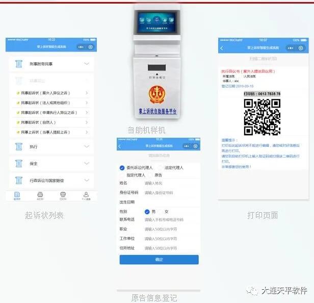 本平台采用通过移动端填写诉状,自助终端打印诉讼文书。特点是填写信息由移动端操作,不限地点、时间,无需排队,由个人移动端通过系统智能引导完成诉状的填写,通过选择题和填空题的问答方式快速让当事人阐述起诉状主题 “诉讼请求”和“事实理由”,自助原告只需按引导问卷中问题的顺序依次做出选择,系统结合《民事诉讼法》对起诉状格式要求:以标题、当事人信息、诉讼请求、事实理由、受诉法院、落款、附件等法律规定的格式自动生成起诉状,自动计算打印份数。为当事人提供高效、格式化、免费的自助诉状生成服务,最后生成打印二维码,到自助打印机前扫描二维码或输入对应的验证码即可将对应的诉状自动打印。移动端操作简单、方便、拥有打印历史记录可进行查询、历史记录可反复打印。真正做到一键轻松扫码 ,掌上多人编写;内容引导填充,智能语音输入;提交合成预览,扫码打印诉状。现代化智能化的使用体验。