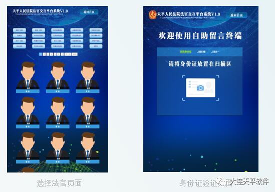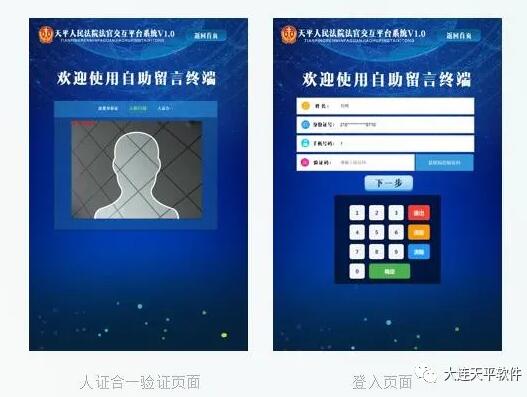 本系统集终端+手机端+云端于一身,采用时下最流行的人证合一身份识别技术(身份证识别、活体人脸识别)以及手机验证码来验证当事人身份,可以减少当事人恶意骚扰法官以及有效的降低安防风险。身份验证后当事人选择自己要留言的法官,出现法官个人关联二维码,用手机微信扫描二维码后出现留言界面,提交即可。同时也可以通过手机拍照,将一些必要的材料通过手机微信发送至本平台,减少当事人跑法院的次数,最大限度的为当事人的诉讼活动提供方便。法官通过使用微信小程序对当事人留言进行回复,回复的内容以短信的形式发给留言者。法官不用接打电话,不用电脑即可回复,移动办公方便高效。