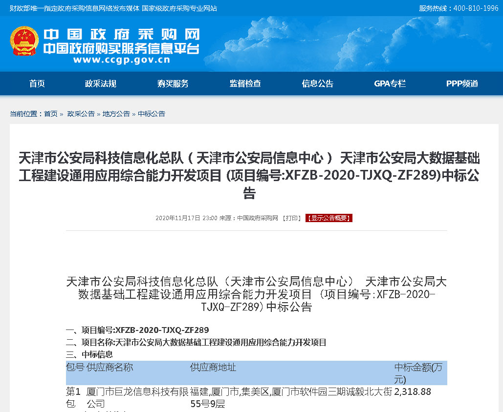 近日,天津市公安局大数据基础工程建设通用应用综合能力开发项目中标结果,在紧张的评比中尘埃落定。巨龙信息经过层层评选,凭借出色的产品与服务成功中标该项目,持续保持市场与技术领先地位。