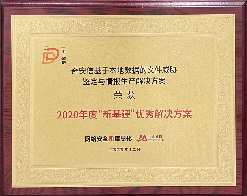 近日,奇安信威胁情报中心推出的“基于本地数据的文件威胁鉴定与情报生产解决方案”,凭借多源化的威胁情报采集能力、精准检测和闭环运行能力,荣获《网络安全和信息化》杂志颁发的“2020年度‘新基建’优秀解决方案”奖。