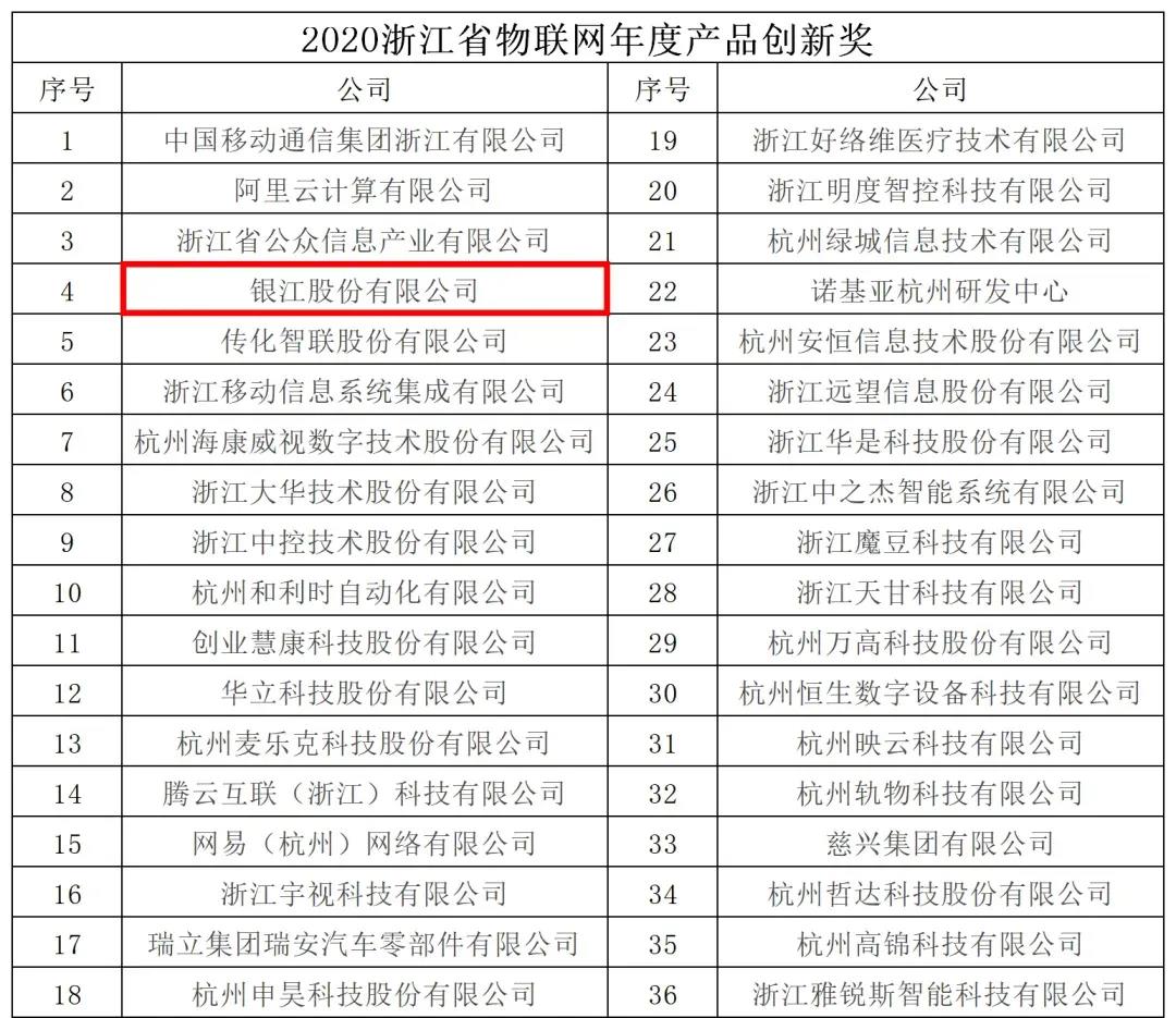 2020年浙江省物联网年度奖项以当年企业各项成绩为标准进行评选,此次银江股份获得“2020浙江省物联网年度领军企业(企业家)奖”、“2020浙江省物联网年度产品创新奖”两项荣誉,既是行业各界对银江的高度认可与关注,也是银江在全省物联网领域的综合竞争力的充分展现。