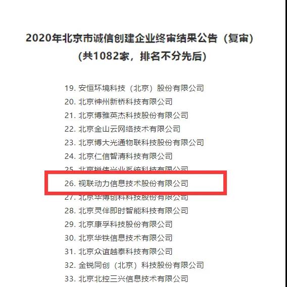 近日,北京市企业评价协会发布2020年“北京市诚信创建企业”终审结果,视联动力信息技术股份有限公司榜上有名!视联动力荣获“诚信创建企业”称号,是肯定,也是鼓励。