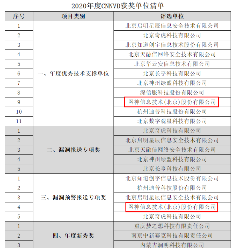 根据《国家信息安全漏洞库(CNNVD)技术支撑单位计划指南》相关规定,国家信息安全漏洞库对现有115家技术支撑单位2020年度支撑贡献情况进行了总结评价。奇安信旗下网神信息技术(北京)股份有限公司作为一级技术支撑单位,获得CNNVD“年度优秀技术支撑单位”和“漏洞预警报送专项奖”两个奖项。