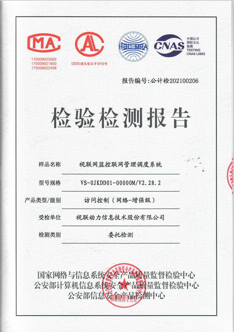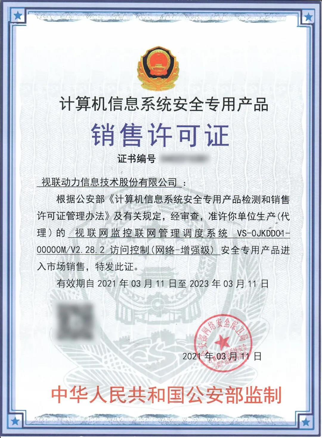近日,视联动力的“视联网监控联网管理调度系统”通过公安部计算机信息系统安全产品质量监督检验中心《信息安全技术 访问控制产品检验规范》标准测评,获得公安部访问控制(网络-增强级)安全专用产品销售许可证。这将是“视联网监控联网管理调度系统”在访问控制领域安全的“身份证”和进入市场销售的“通行证”,也是对“视联网监控联网管理调度系统”的肯定。
