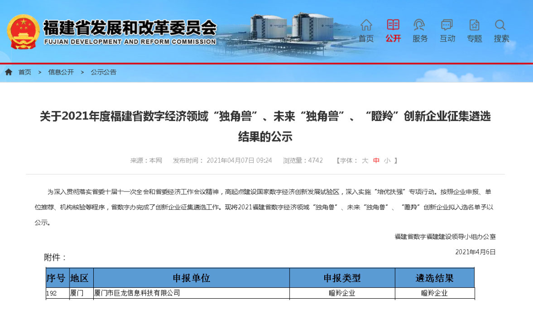 巨龙信息凭借在信息化领域的突出发展潜力成功入选2021年度福建省数字经济领域“瞪羚”创新企业名单。这是继2020年后,巨龙信息再次入选瞪羚创新企业。