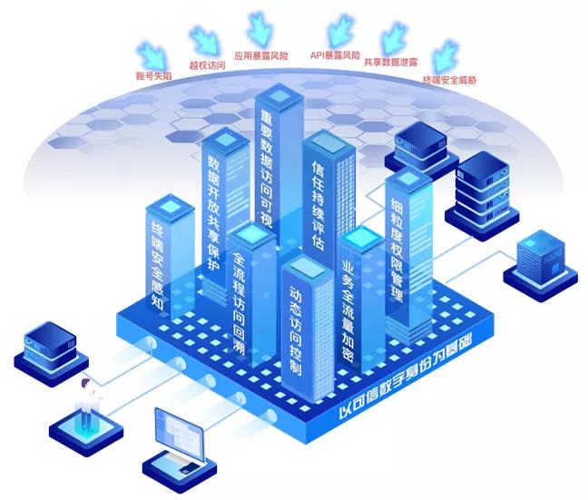 安恒信息基于零信任思想,结合多年在企业安全运营、安全大数据分析、数据安全等领域的实践与技术积累,推出了基于“以身份为基础、以资源为核心、持续信任评估、动态访问控制”的AiTrust零信任解决方案,在原有物理边界之上构建动态身份边界,从终端、用户、系统等资源访问主体的可信身份出发,向政企提供全新的业务安全视角,有效支撑应用开放、业务互通、数据共享等场景的安全、高效运转,助力政企网络安全体系逐步向自适应安全演进。