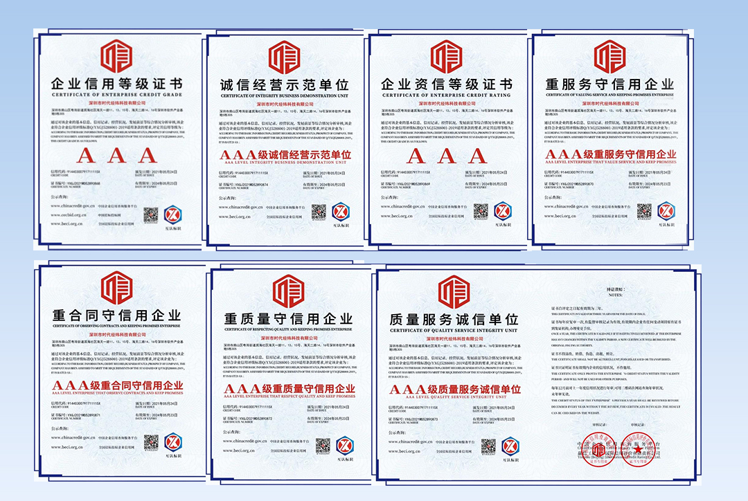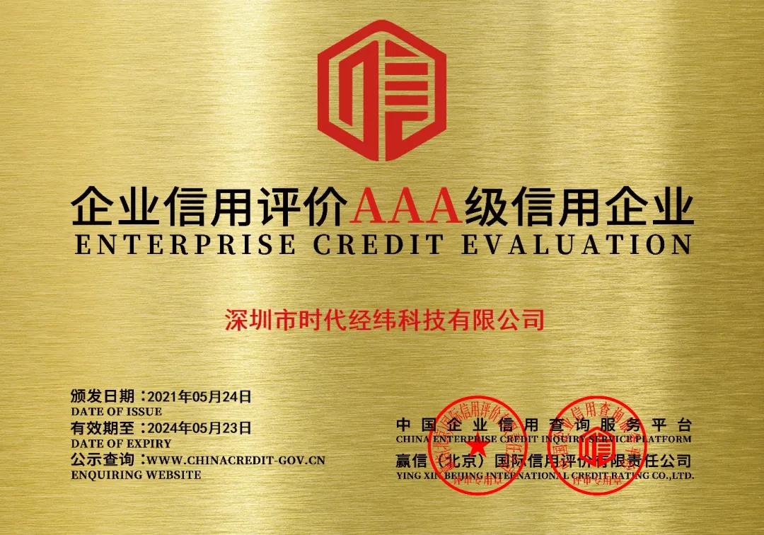 近日,经过中国招标投标网、中国企业信用查询服务平台、全国招标投标企业信用网、中国人民银行备案的第三方信用认证机构赢信(北京)国际信用评价有限责任公司的严格审核,深圳市时代经纬科技有限公司荣获AAA级企业信用等级证书及AAA级企业资信等级证书,同时被授予“AAA级重合同守信用企业”、“AAA级重质量守信用企业”、“AAA级重服务守信用企业”、“AAA级质量服务诚信单位”、“AAA级诚信经营示范单位”荣誉称号。