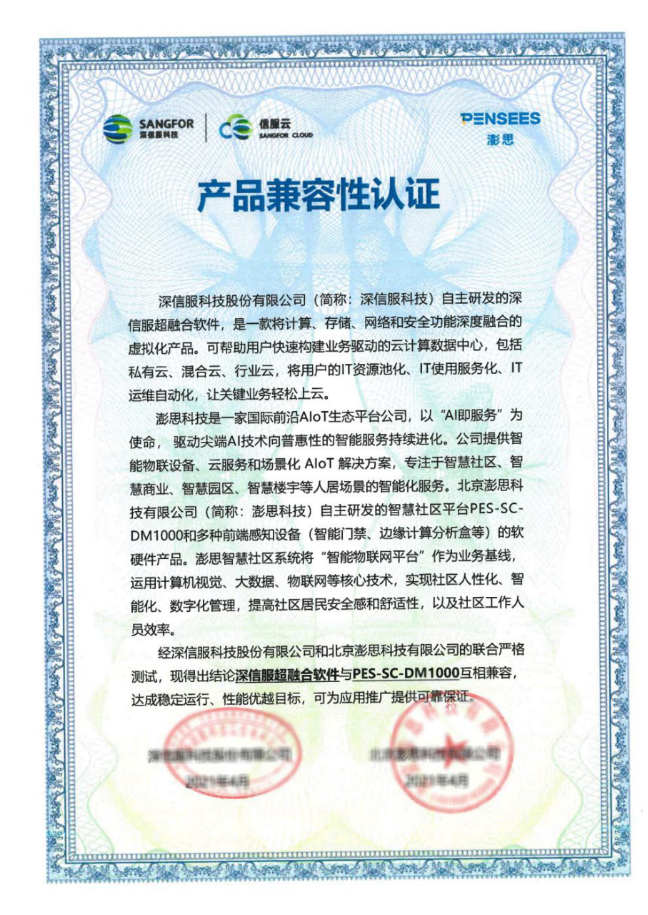 近日,深信服与北京澎思科技有限公司(简称“澎思科技”)完成产品兼容性互认证,双方经过联合严格测试,深信服超融合软件与澎思科技PES-SC-DM1000互相兼容,运行稳定,性能优越。