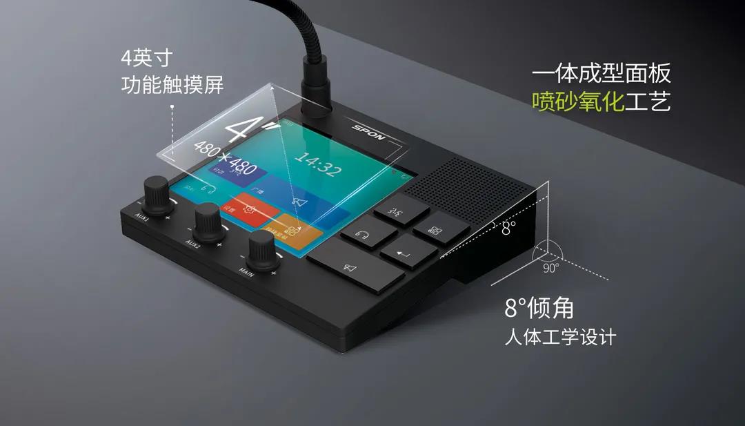 新一代IP网络广播话筒是4寸液晶触摸屏,采用8°倾角人体工学设计,铝合金面板一体成型,实现高密度,低阻抗的效果。为了让老师获得独特的播音体验,4路调音与播控一体,可选择触摸和按钮操作方式,灵活调节。