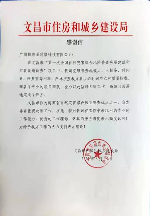 6月15日,海南省文昌市住房和城乡建设局向都市圈发来感谢信,对公司在文昌市“第一次全国自然灾害风险普查房屋建筑和市政设施调查”项目中的工作表示感谢。