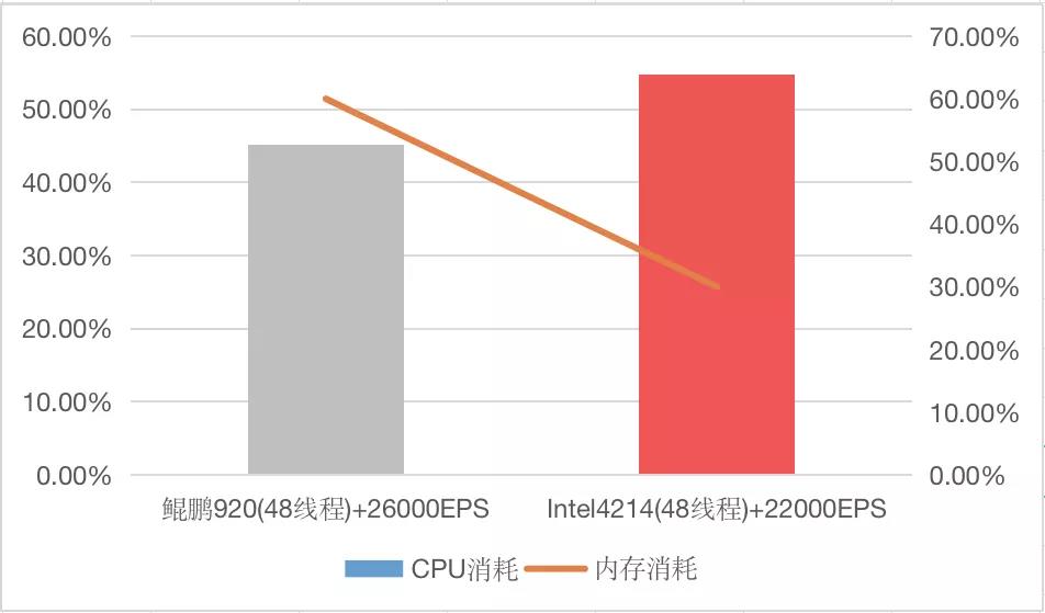 明御综合日志审计分析平台使用JAVA程序进行数据加密,性能测试针对15000EPS的数据量进行测试,观测数据是否发生堆积。在鲲鹏服务器下进行数据处理,发生数据堆积,其堆积队列大小为20000,鲲鹏处理器内置KAE加速引擎,处理数据达到15000EPS时没有出现数据堆积,同时将数据量持续增加,也未见出现性能瓶颈。在具备相同线程数CPU情况下,明御综合日志审计分析平台搭载鲲鹏处理器通过BoostKit全栈优化后,未出现数据堆积。