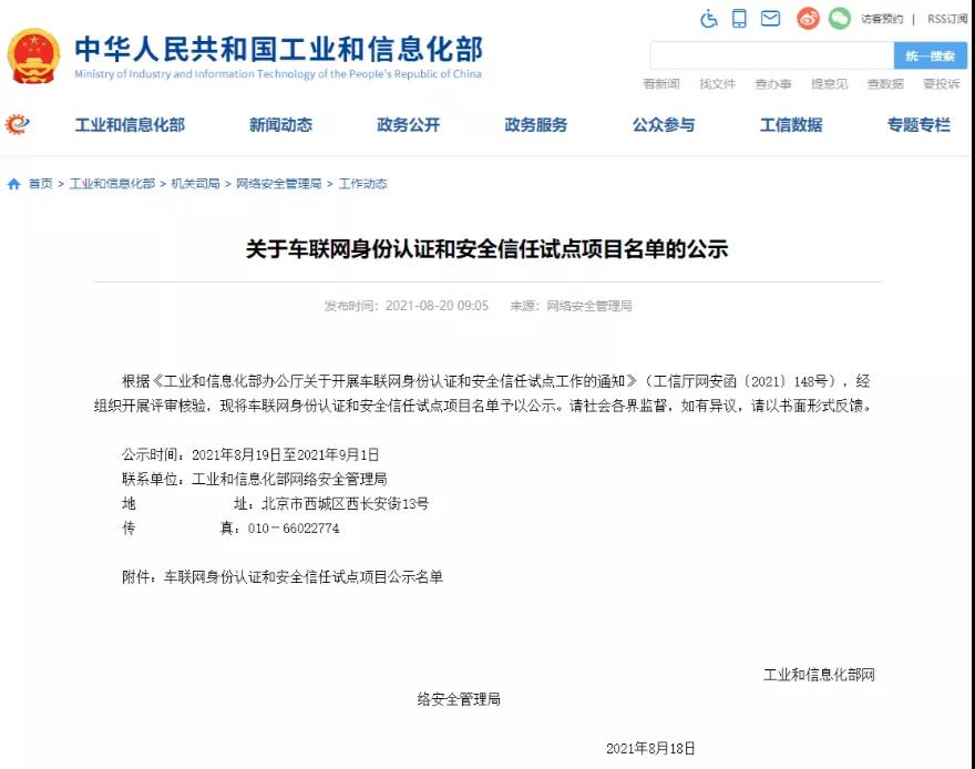 8月20日,工业和信息化部网络安全管理局公布了车联网身份认证和安全信任试点项目认定结果的通知。