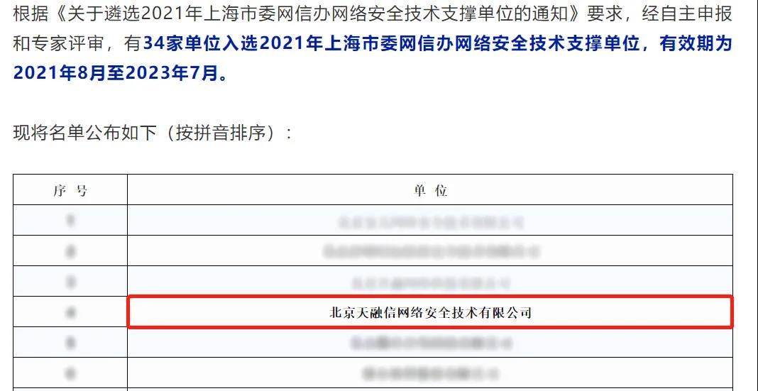 为加强上海市网络安全技术支撑体系建设,强化网络安全事件应急处置能力,提升网络安全工作保障水平,依据《中华人民共和国网络安全法》和《国家网络安全事件应急预案》相关要求,按照开放、合作、自愿的原则,上海市委网信办组织开展了2021年度网络安全技术支撑单位遴选工作。经过自主申报和专家评审,天融信成功入选2021年上海市委网信办网络安全技术支撑单位。