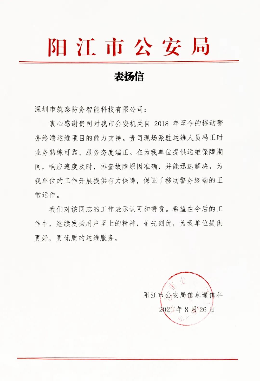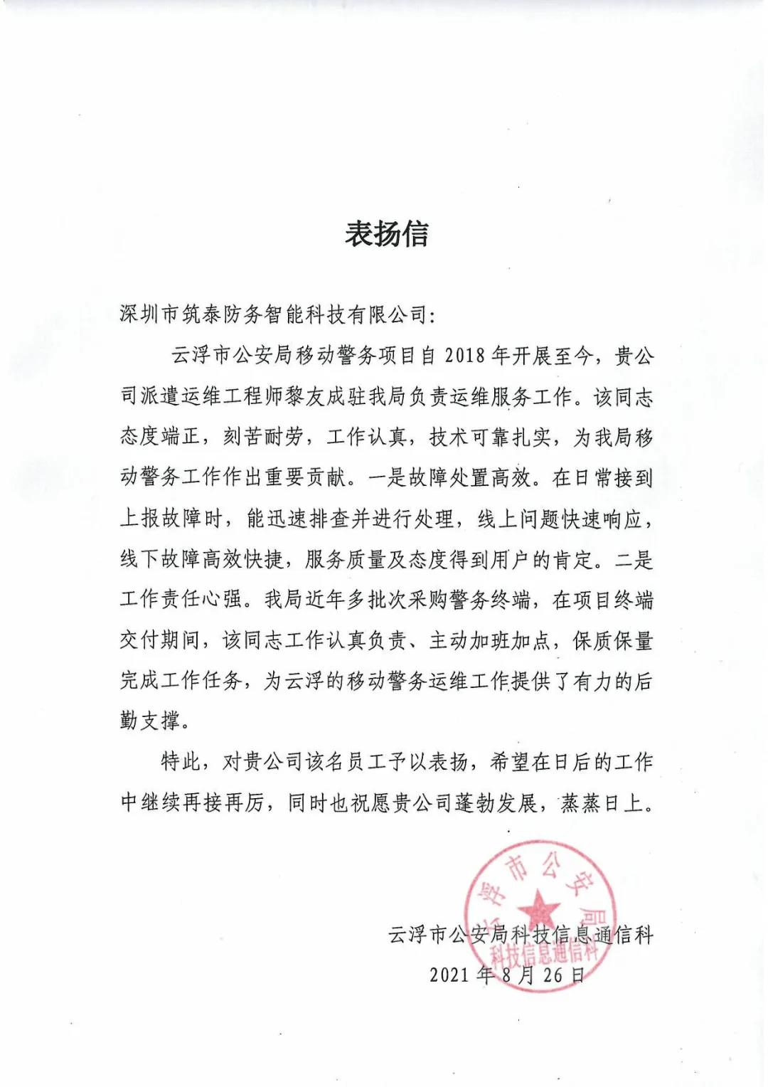 继8月中上旬收到的3封表扬信后,8月26日,筑泰防务再次收到来自阳江市公安局及云浮市公安局发来的《表扬信》,信中肯定了筑泰防务自2018年以来为阳江公安、云浮公安移动警务项目提供的运维服务,高度认可了驻场运维工程师冯正时、黎友成过硬的技术水平、专业的运维能力及良好的服务态度。截止目前,筑泰防务在今年内已累计收获5封分别来自肇庆、江门、顺德、阳江、云浮的感谢信。