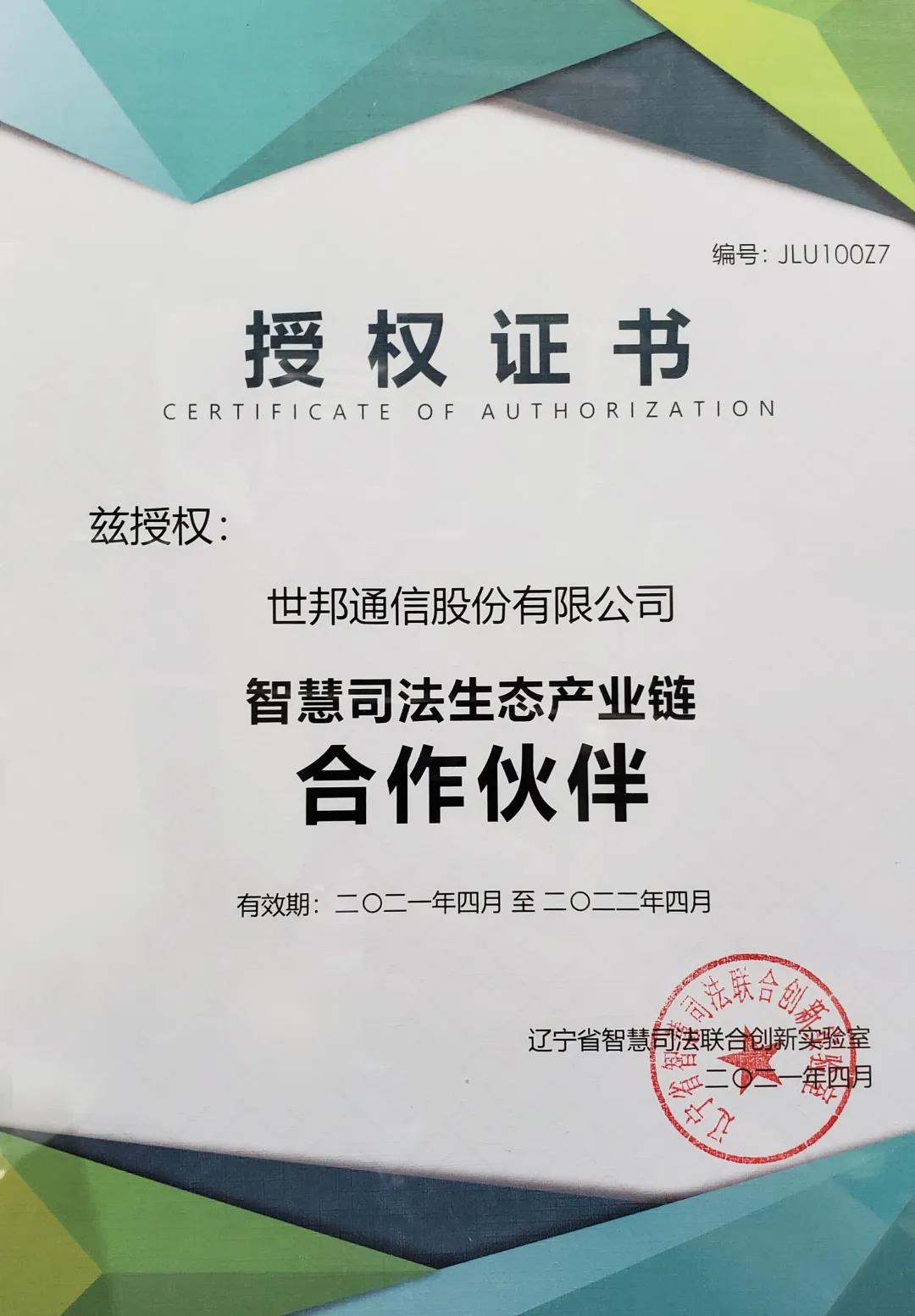 世邦通信经辽宁省智慧司法联合创新实验室授权,成为其智慧司法生态产业链合作伙伴。