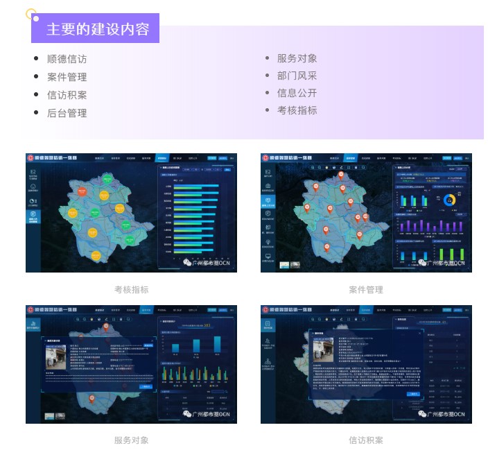 为加快顺德区智慧城市建设应用,落实智慧信访工作,协助信访工作完成业务统计分析,提高工作效率,结合现有系统实际情况,通过对信访一体化系统的数据进行挖掘、统计和分析,以更直观的方式对信访数据进行可视化展示以及数据分析。都市圈承建的顺德智慧信访一张图系统应运而生,系统包括八大软件功能模块的开发和一个基础支撑系统的搭建。全方位提炼和发现重要信访信息,从信访大数据中发现隐藏的信访信息和规律,实时、动态提供信访趋势预测,帮助部门实时掌握信访发展趋势预测,提高政府对社会风险的感知、预测和防范能力。
